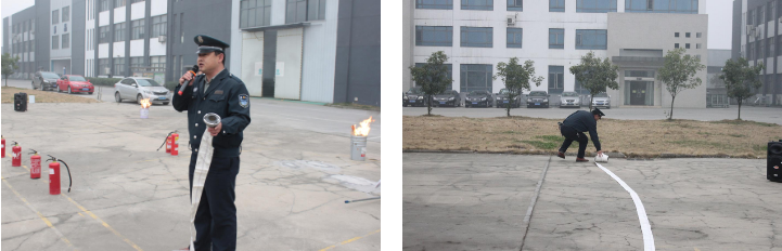 針對距離較長、突發(fā)火災(zāi)或猛火,保安部謝隊長做了詳細(xì)的介紹,并實地演練了水帶、水槍、閥門、接頭的正確使用與安裝順序,并為員工展示了鋪設(shè)水帶、安裝閥門和銜接水槍。